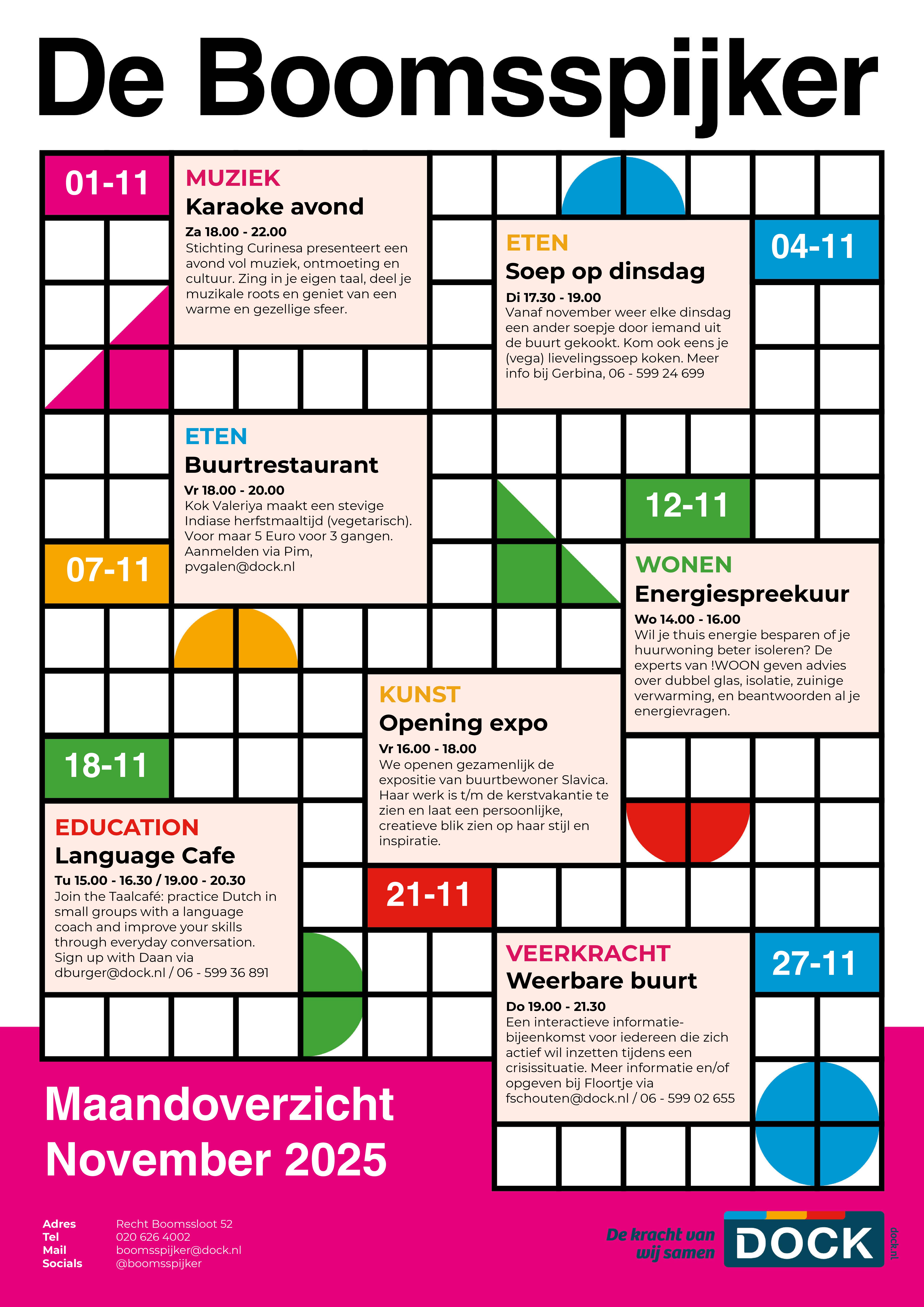 Alle activiteiten die in De Boomsspijker worden georganiseerd, kun je overzichtelijk bekijken in het activiteitenoverzicht.