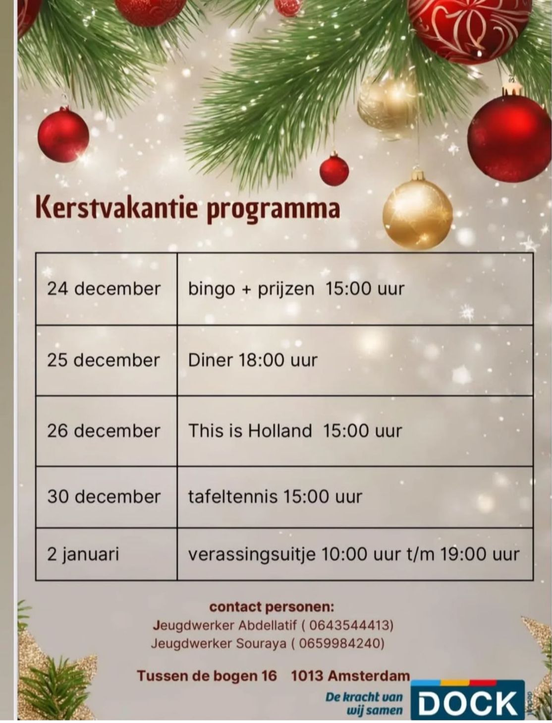 Op 21 december organiseert DOCK Nieuw-West de grote editie van Winterwonderland! Er zijn tal van activiteiten voor jong en oud, en iedereen is welkom. Omdat het jongerenwerk in Nieuw-West stopt, worden er in de kerstvakantie geen extra activiteiten voor jongeren georganiseerd. In het nieuwe jaar kun je bij andere jongerenwerkorganisaties terecht voor leuke activiteiten.